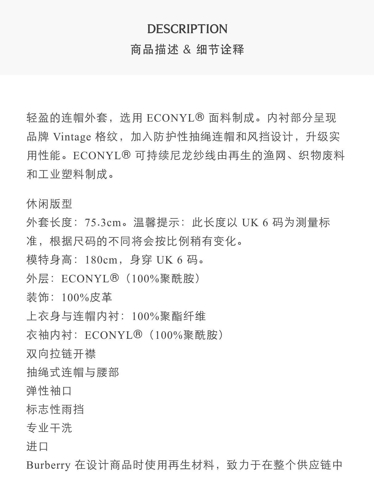 【官方正品】BURBERRY| 女装 尼龙轻盈连帽外套 80429011
