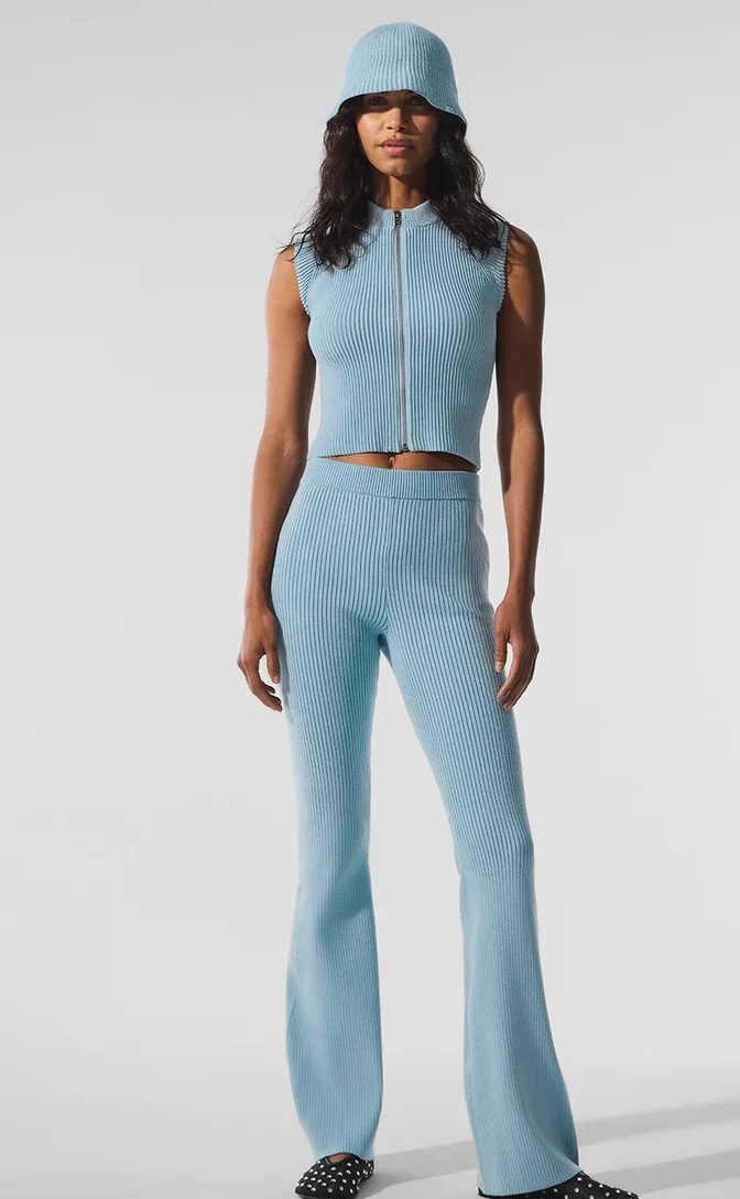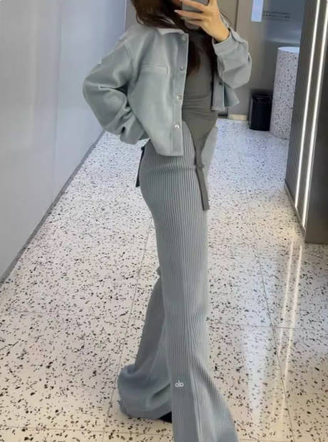 Alo Yoga Denim Knit 高腰螺纹修身微喇叭裤阔腿女直筒垂感休闲裤