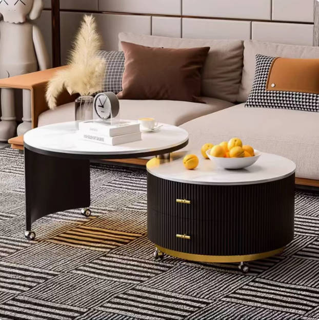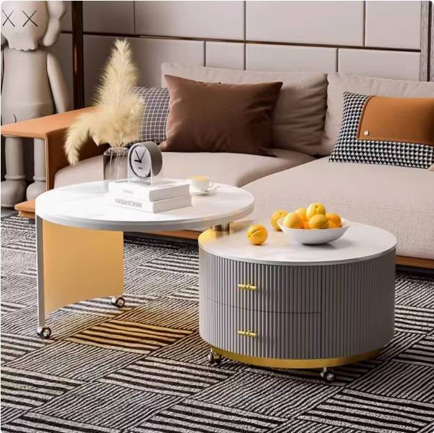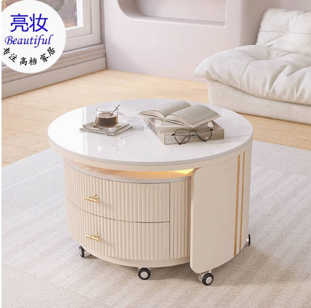 2025新款茶几客厅家用小户型现代轻奢奶油风移动圆形旋转岩板茶几