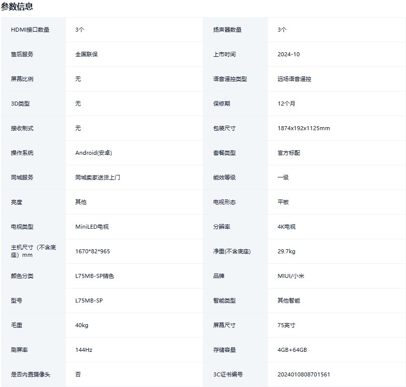 小米S Pro MiniLED 75英寸2304级分区高刷平板电视机以旧换新补贴
