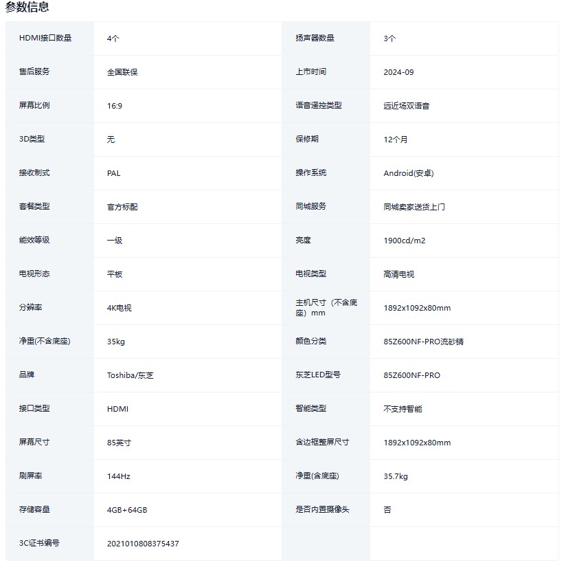补贴东芝电视85英寸小芝士MiniLED智能4K液晶144Hz平板Z600NF PRO