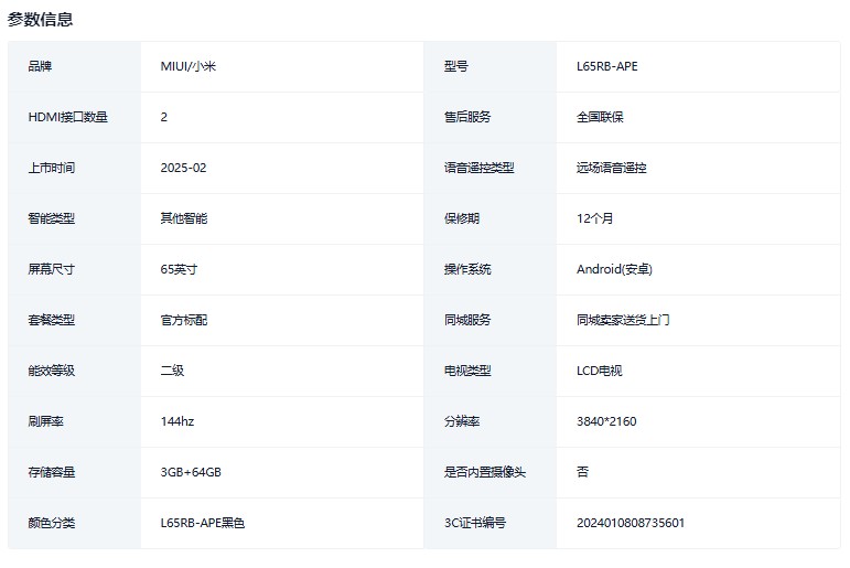 小米REDMI A Pro65英寸高清144Hz高刷平板电视机2025以旧换新补贴