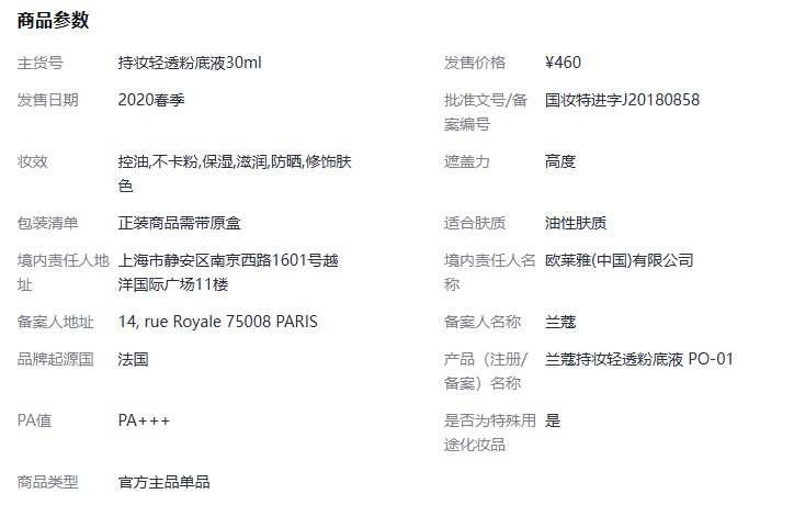 兰蔻 持妆 轻透粉底液 控油不卡粉保湿滋润防晒修饰肤色 油皮 第一代 30ml