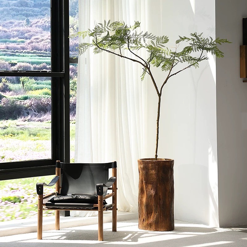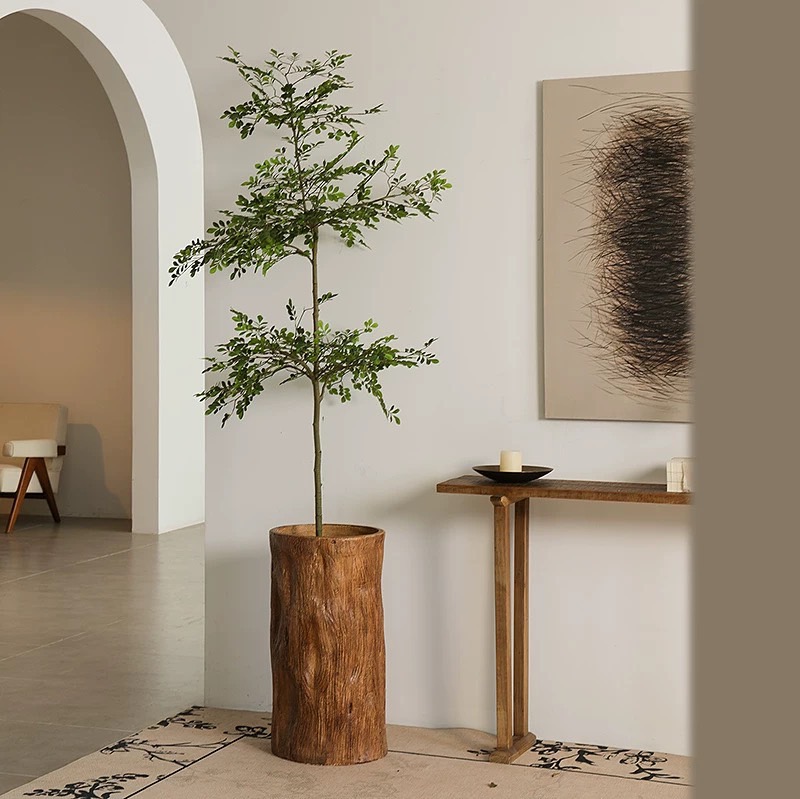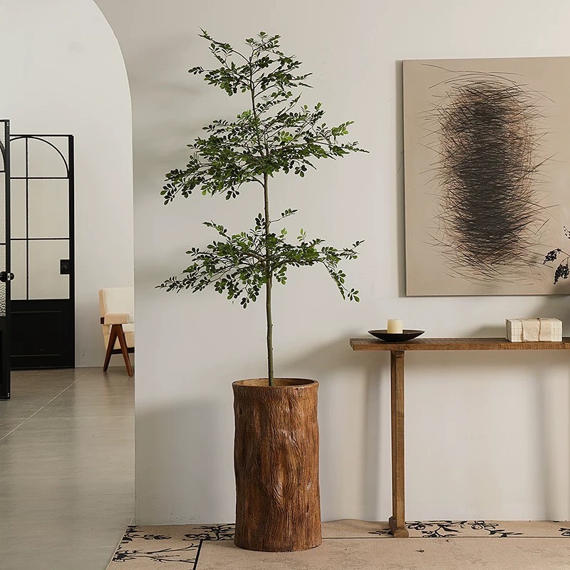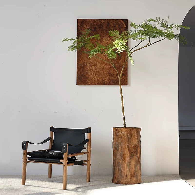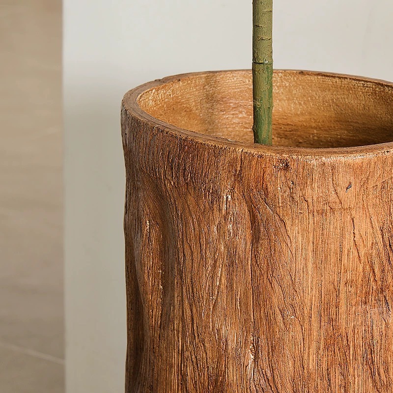 形上中古风仿木桶落地花器酒店民宿餐厅复古仿真绿植水泥花瓶摆件