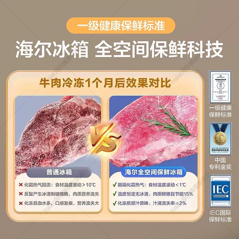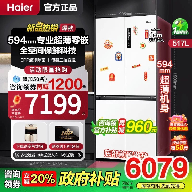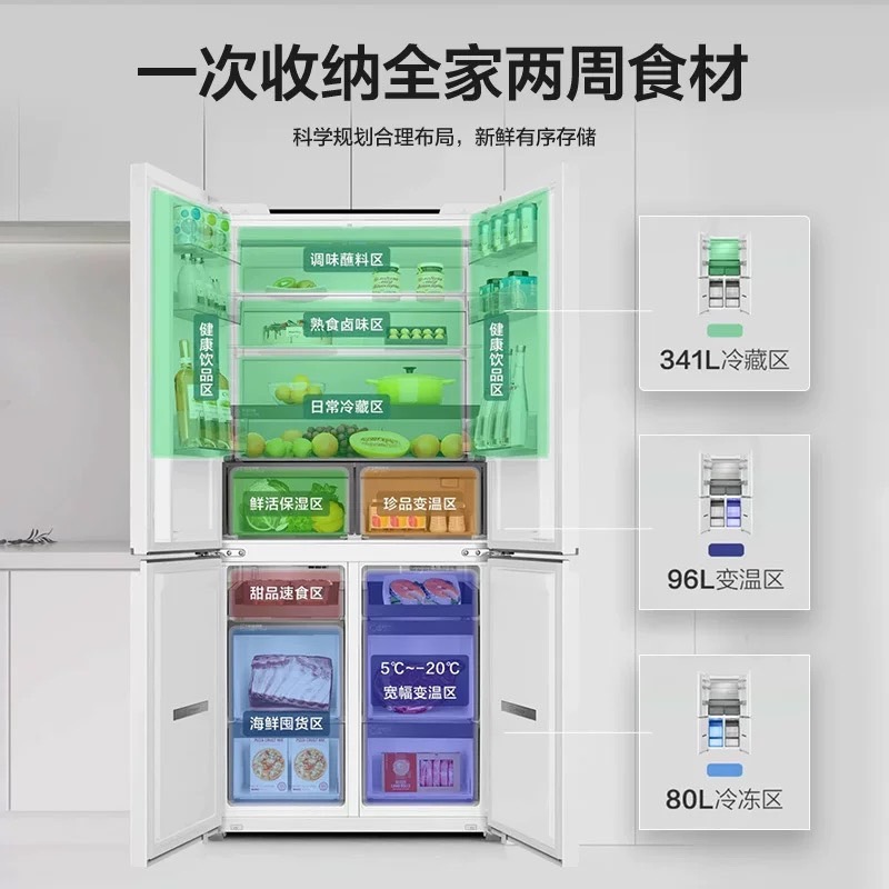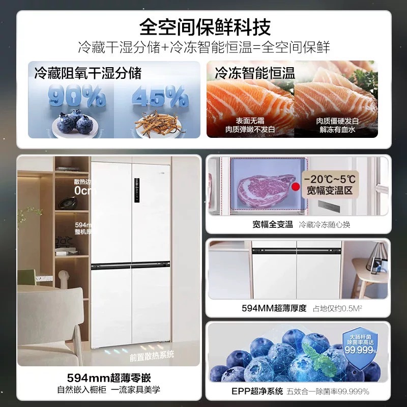 【超薄594mm】海尔电冰箱0cm零嵌入517L十字对开四门家用一级能效