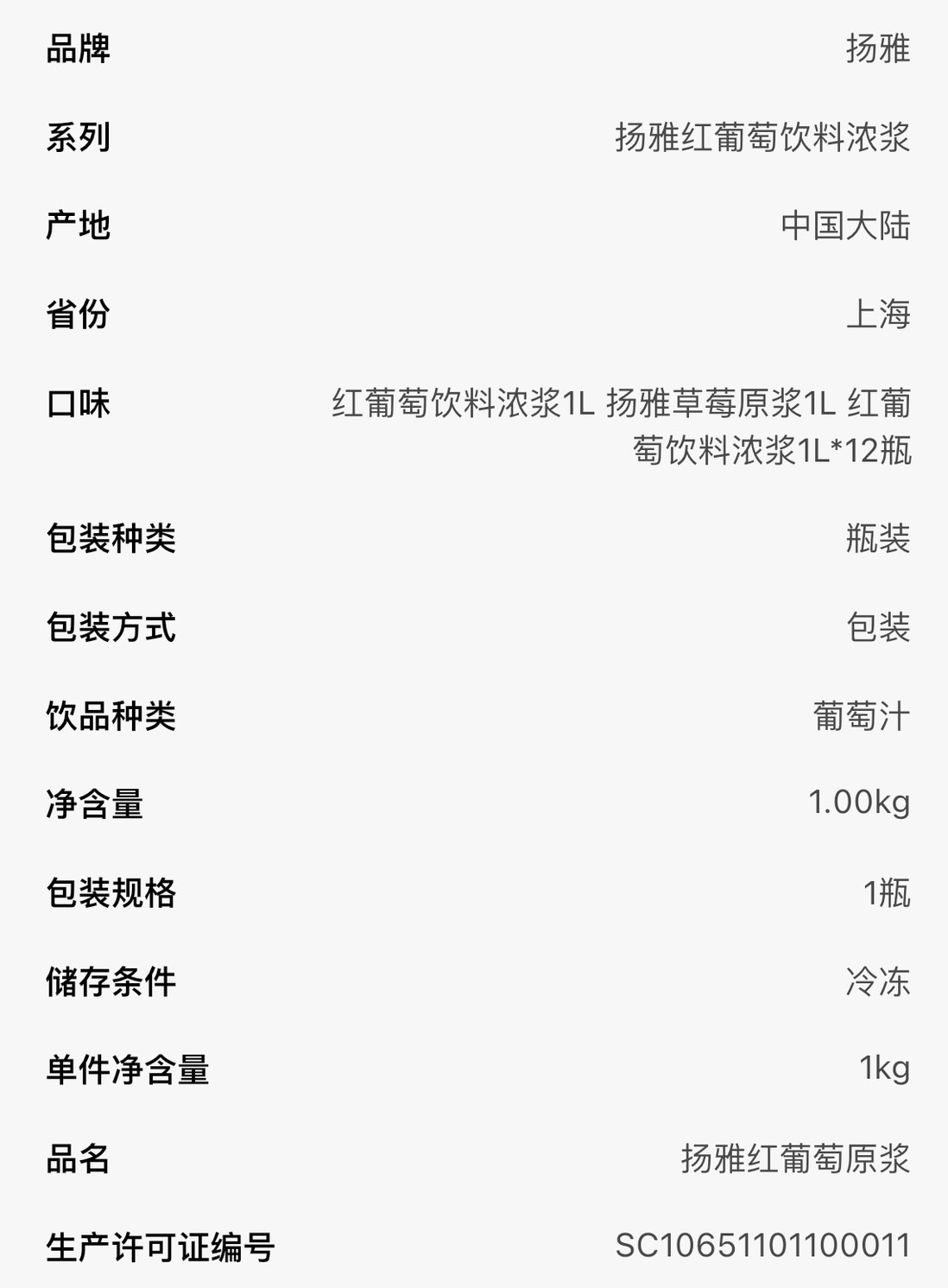 扬雅冷冻葡萄果汁原浆原榨红葡萄汁饮料多肉葡萄奶茶店专用果汁1L