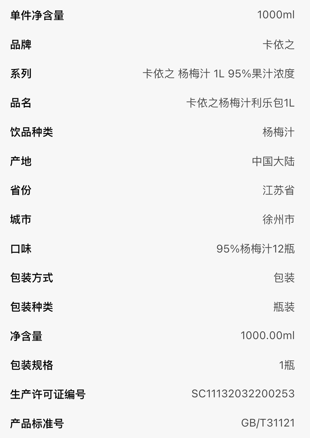 正品kaiz卡依之杨梅汁饮料12瓶1L装慈溪特产高端纯果蔬汁吉祥航空