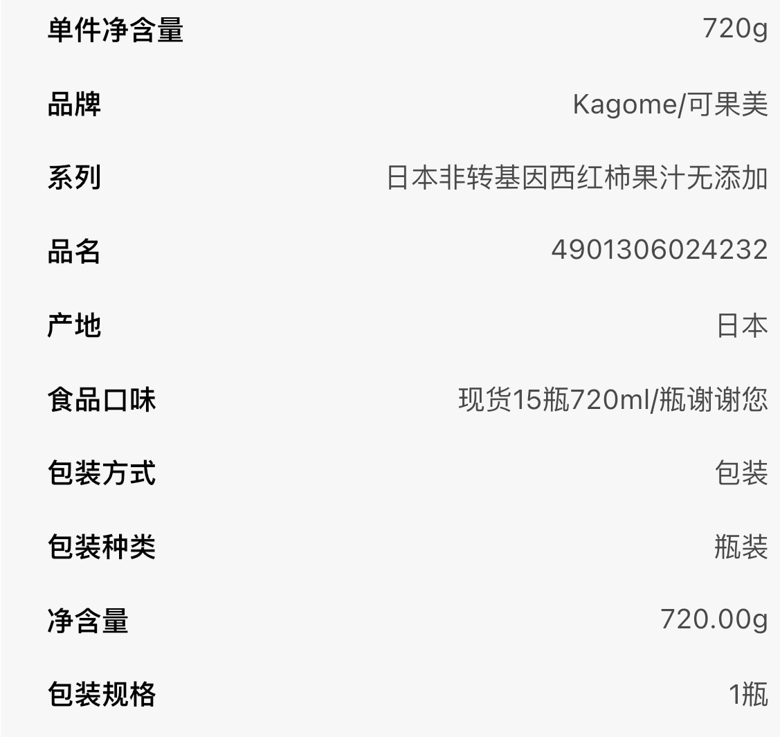 现货15瓶日本KAGOME可果美非转基因西红柿蔬菜果汁无食盐720ml/瓶