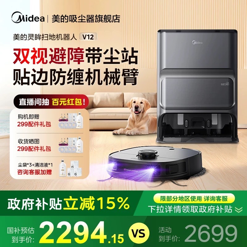 【政府补贴20%】美的V12扫地机器人家用自动扫拖一体集尘上下水版