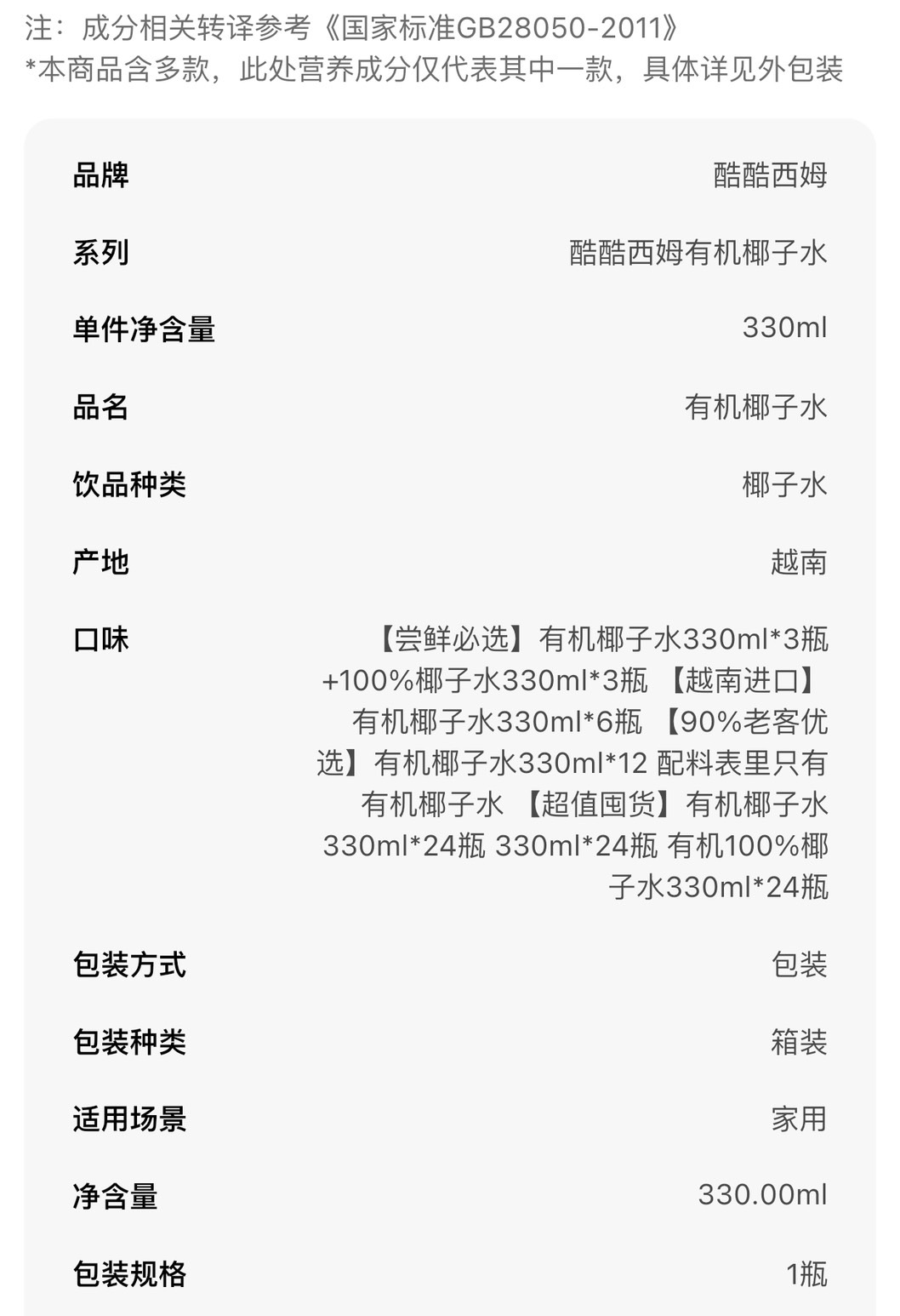 【陈洁38大促】COCOXIM酷酷西姆有机100%椰子水330ml*24瓶