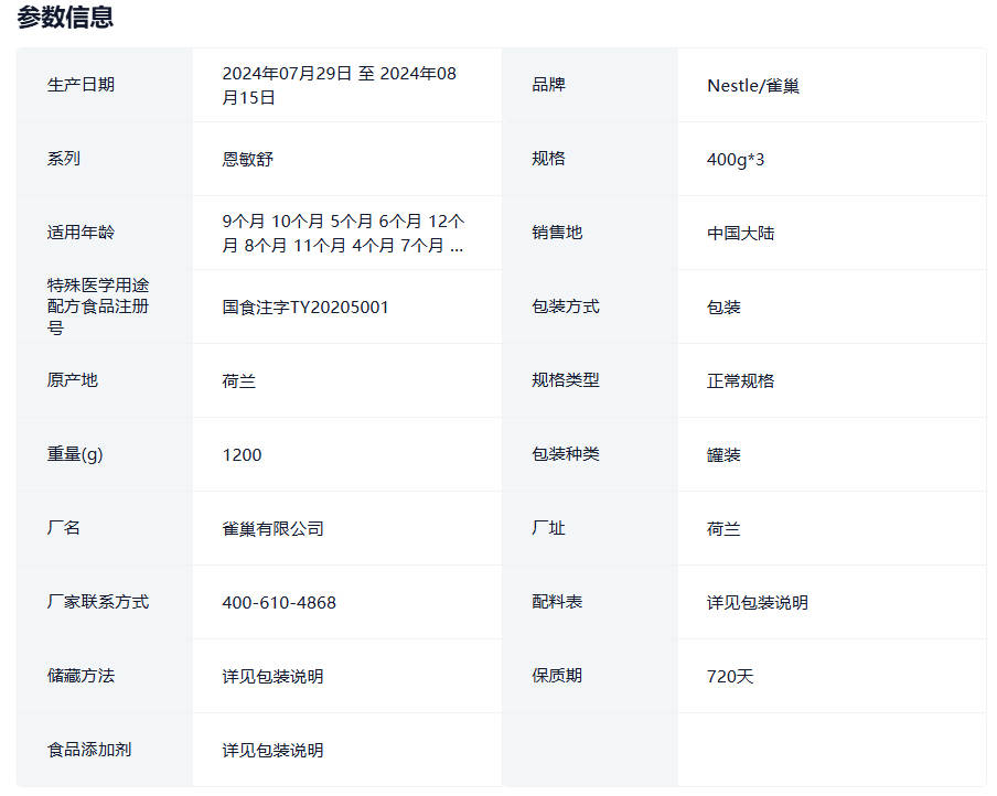 雀巢恩敏舒特殊医学用途婴儿氨基酸配方食品400g3