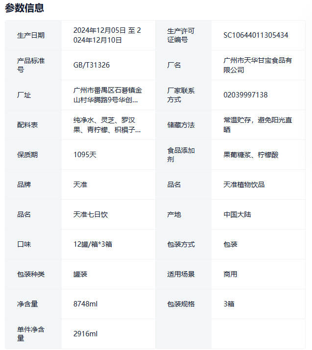 天准七日饮植物饮品243ml12罐装3整箱天华甘宝植物饮料