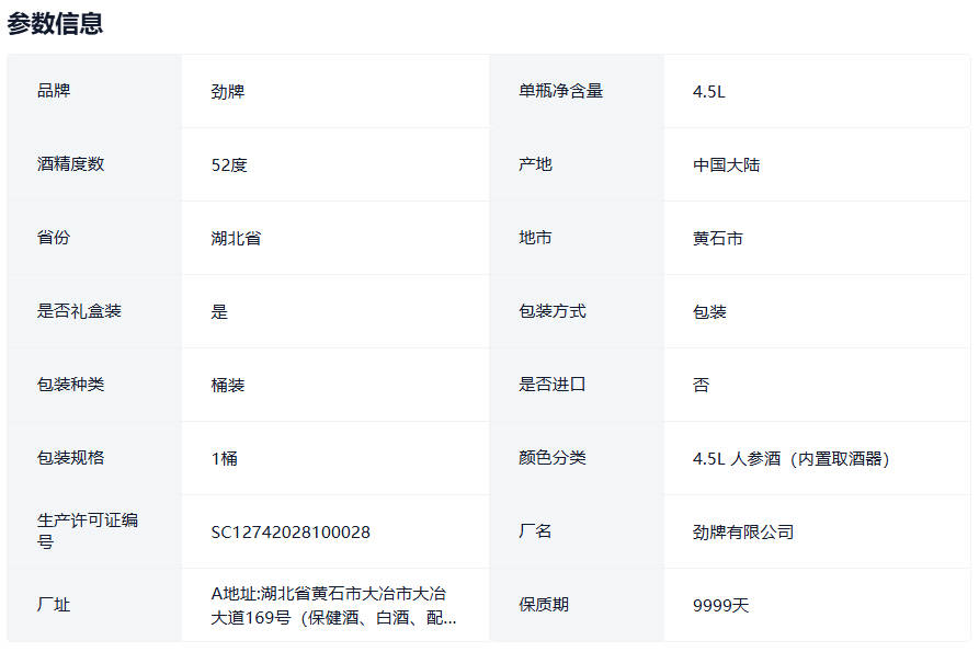 【天天满减】劲牌52度人参酒4.5L劲酒厂家直营家庭酒正品官方旗舰