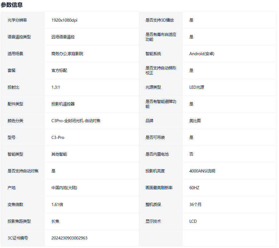 奥比图C3Pro投影仪家用超高清无需幕布家庭影院办公会议酒店投影