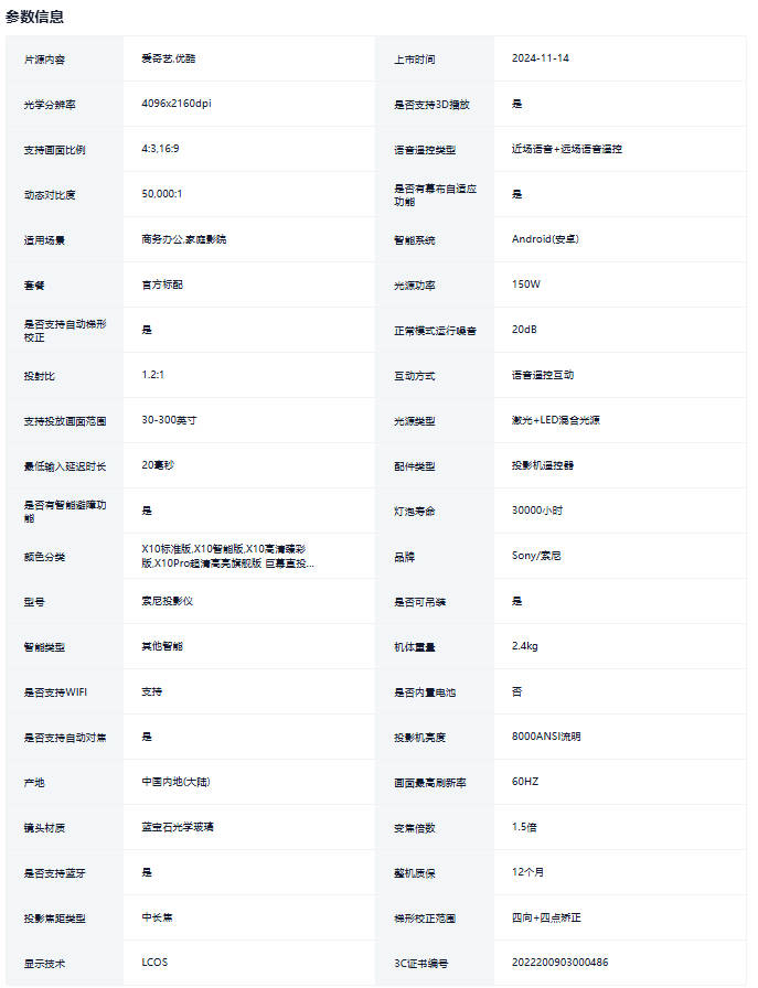 索尼【补贴15%】2025新款超高亮投影仪白天家用强光投白墙4K超清无需幕布云台自动款手机投屏激光投影机商用