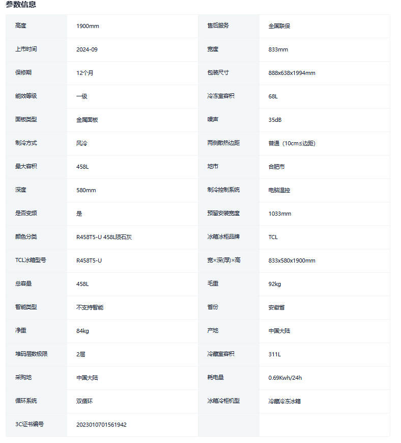 TCL 458升T5十字四门58cm超薄宽幅变温风冷无霜小型家用电冰箱