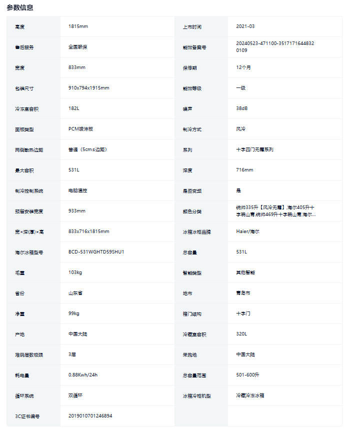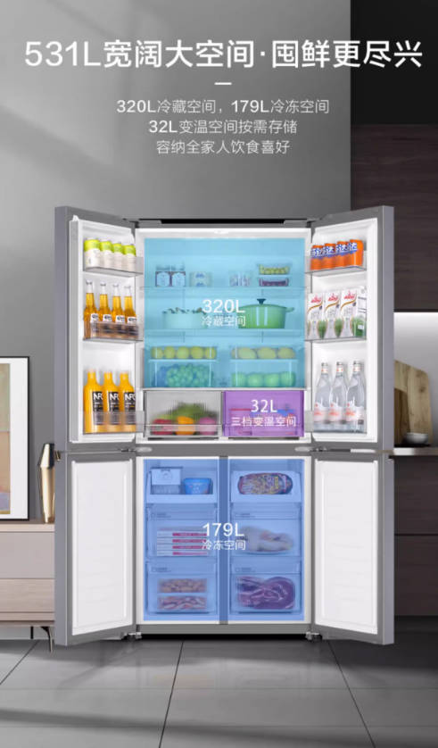 海尔531L十字对开双开四门一级大容量家用风冷无霜超薄嵌入式冰箱