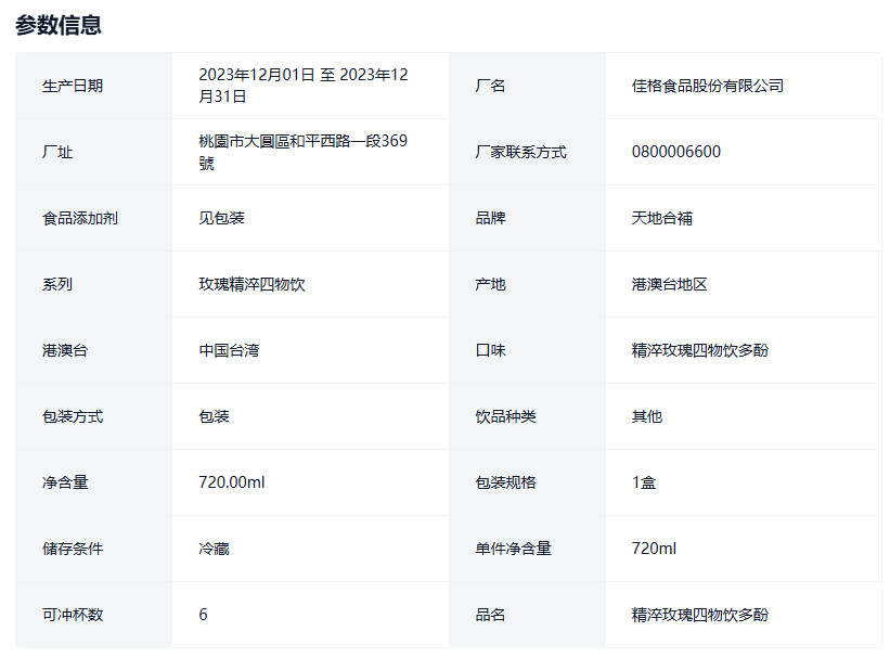 台湾采购天地合补精淬玫瑰四物饮120ml x 6入